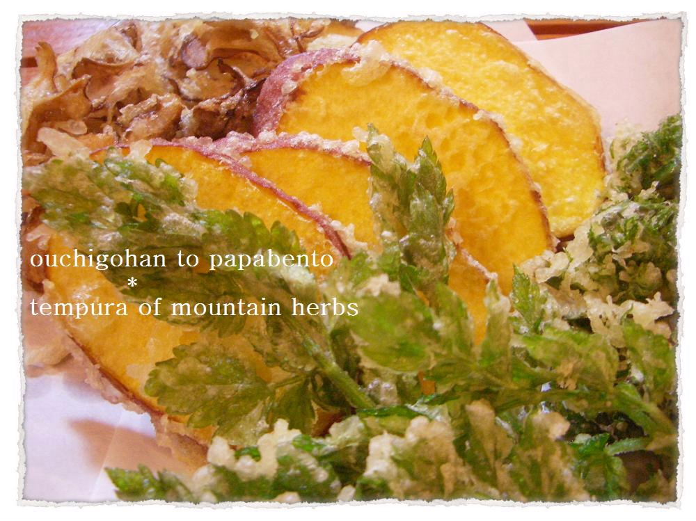 これはわたしの母が作った天ぷらです。母が友達と摘んできたセリと、渓流釣り好きの弟が摘んできたというこごみ、サツマイモ、マイタケです