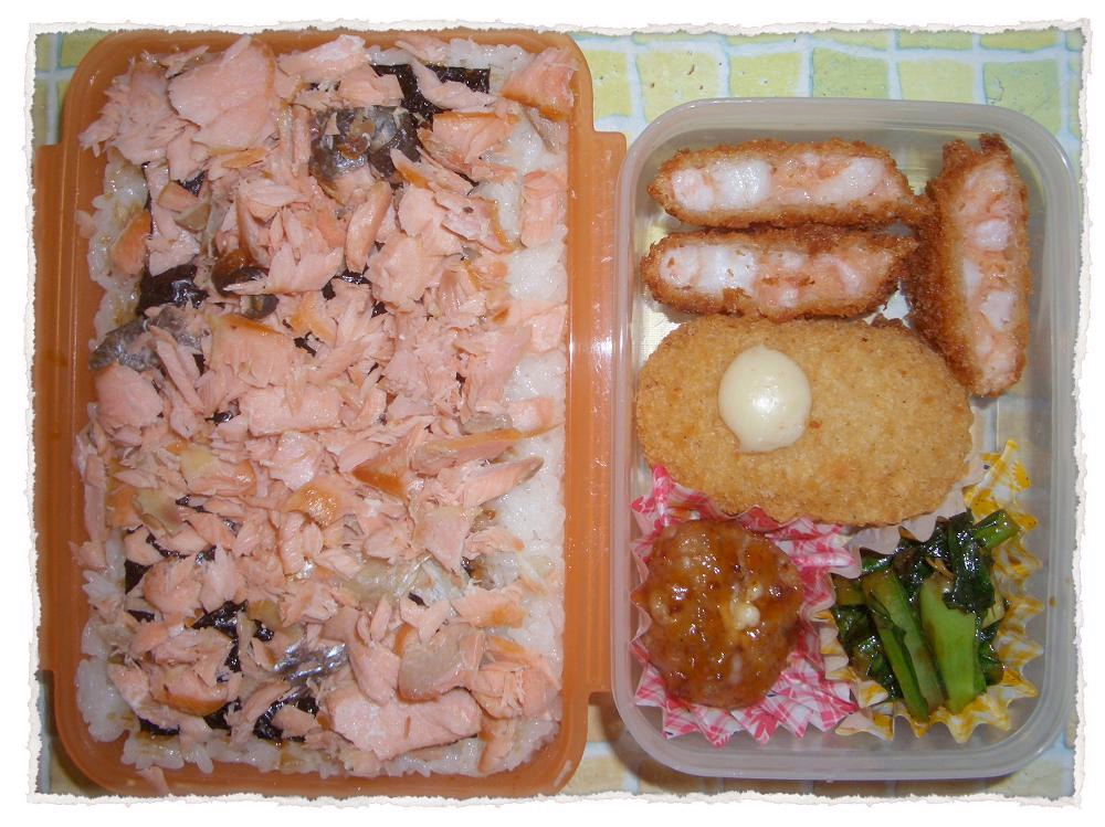 小松菜のオイスターソース煮びたしこれ本当はもっとキレイだったんだけど、鮭の身が厚すぎてフタが閉まらず。写真撮るより先に、ダーさまが自分で鮭をほぐしてくれちゃったんですねぇ。。。 なので美しくないですが、パルシステムのお気に入り、北海道野付産秋鮭弁当です