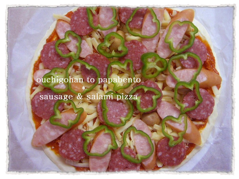 1枚目のピザはソーセージとサラミとピーマン。作り置きしてあったピザソースで。