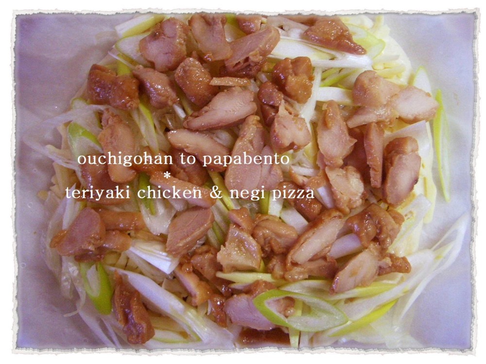 3枚目は照り焼きチキン。市販の照り焼きソースを片栗粉で粘りをつけて塗り、チーズの上にスライスもちを、その上にネギをたっぷり、作り置きしておいた照り焼きチキンをたっぷりです。